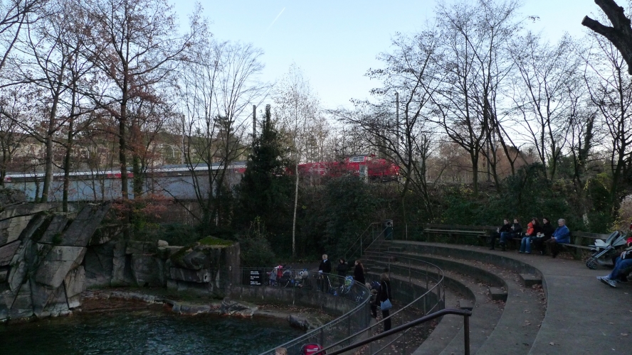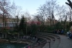 Kinder verfolgen begeistert die Seelöwenfütterung. Die Seelöwen schreien und springen mit lautem Platschen ins Wasser.