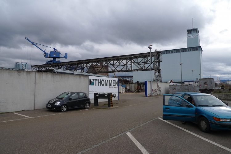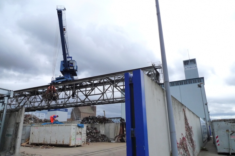 Im windigen Hafen verlädt ein Kran Metall-Schrott in Container. Ein Auto fährt vorbei. In der Ferne tutet ein Schiffshorn.